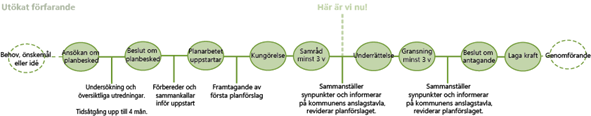 Planförslaget hanteras med ett utökat förfarande (se figur nedan). Samrådet är det första tillfället för allmänheten och myndigheter att tycka till om förslaget. Samrådet syftar till att samla in information, önskemål och synpunkter som berör planförslaget och överväga dessa i ett tidigt skede av detaljplanearbetet. Planförslaget kan komma att ändras mellan samråd och granskning.